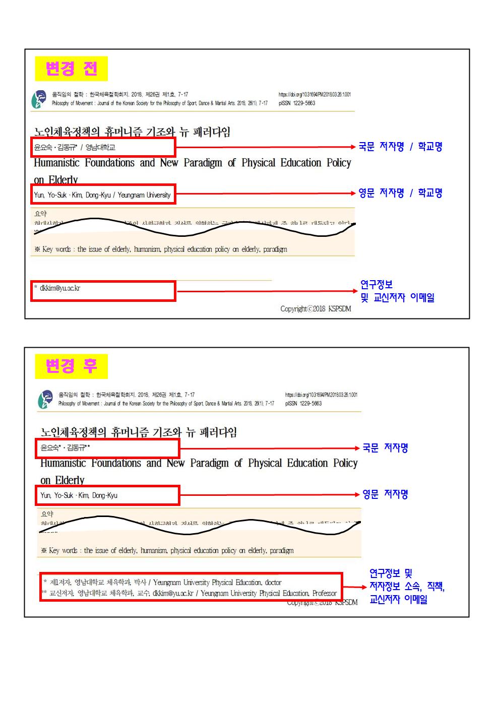 교육부의 「연구윤리 확보를 위한 지침」 개정에 따라, 각 학술단체에서 발행하는 논문의 저자 정보를 확인·정비하여 조치 결과를 제출하도록 하여, 2019년 27권4호부터 아래와 같은 내용으로 변경되었습니다.